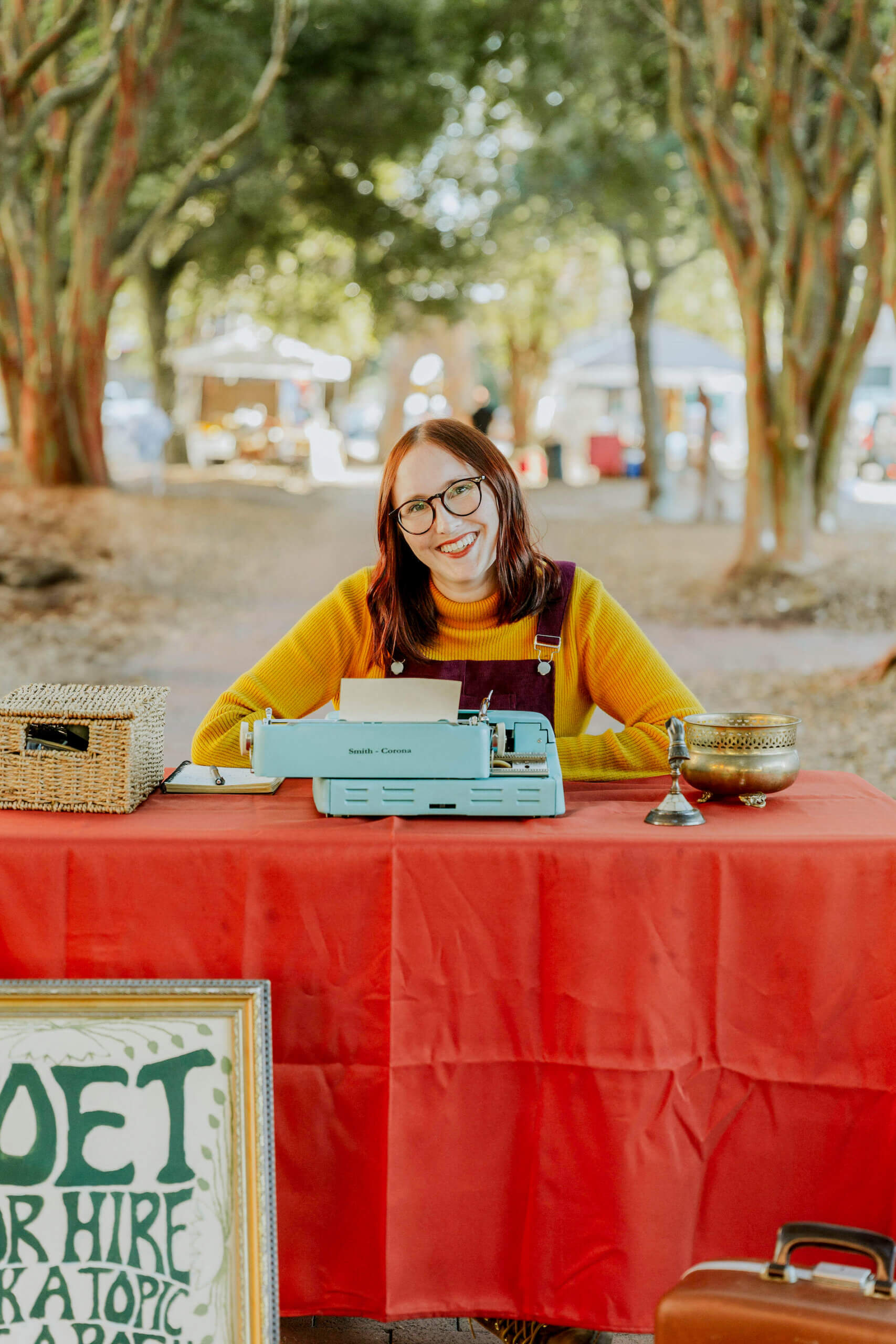 If poetry is the spontaneous overflow of powerful emotion, then Lachlan Woodson aptly captures that flow when she creates poems on the spot for passerbys who request her custom typewritten poetry. Woodson was born and raised in the Florida Panhandle with a writing practice born out of the compulsion to release thoughts and emotions. She finds inspiration in the words of others, and her poetic influences range from Rainer Maria Rilke and Emily Dickinson to singer-songwriters like Jenny Lewis and Phoebe Bridgers, as well as pop stars such as Taylor Swift and Lana Del Rey.