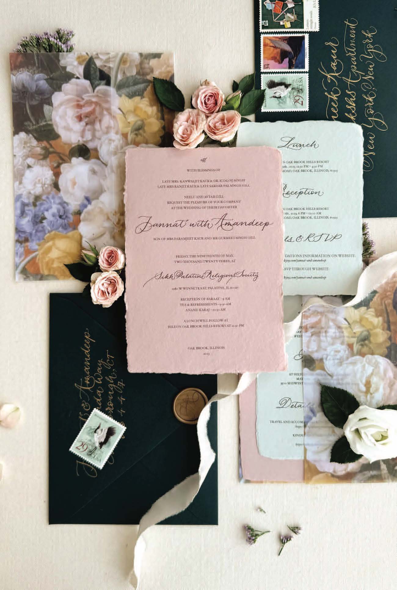 You’re newly engaged and it’s time to start sharing the exciting news and inviting loved ones to save the date. In a world where text messages and social media often deliver news and invitations, sending a tactile, custom wedding invitation offers a more personal touch—one that is both eye-catching and memorable while reflecting your unique story and leaving a lasting impression. Beautifully crafted wedding invitations that line up perfectly with your vision not only delight guests but also set the perfect tone for your wedding day. The typical ensemble consists of a full six-piece invitation suite including the invitation, details and RSVP cards plus envelope as well as outer envelope and envelope liner. Below, we highlight the many ways invitation ensembles can be personalized, from choices of calligraphy and colors to paper choices, printing techniques and thoughtful add-ons, so each piece aligns with your overall wedding aesthetic.
