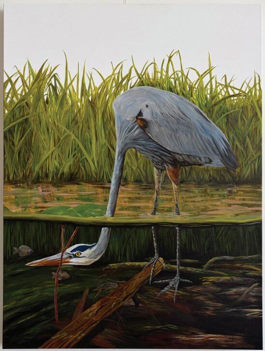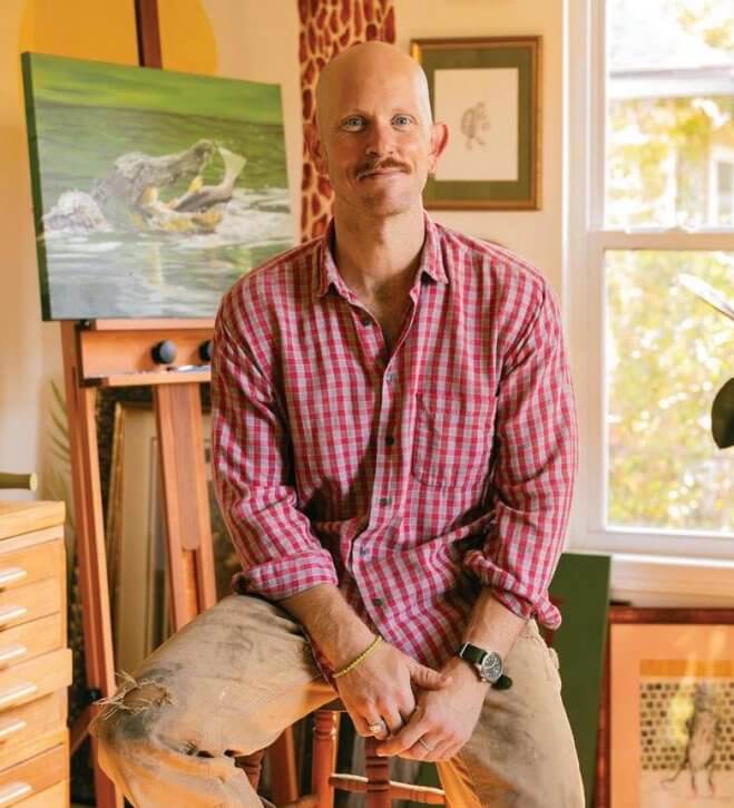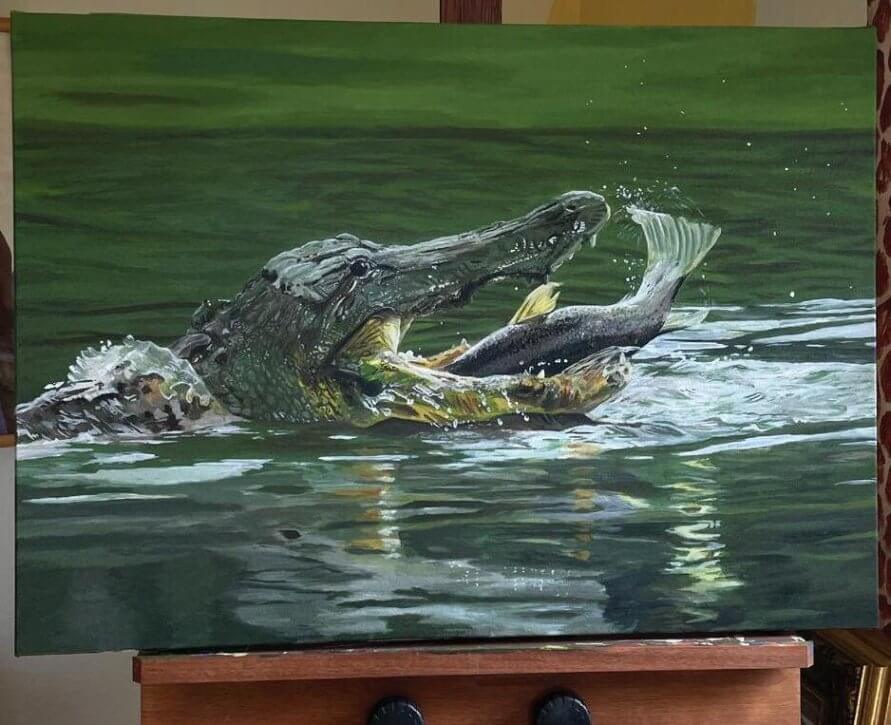 While nature provides inspiration to Schweigert’s works, he also finds a source of inspiration in a person he never met but knows well through a shared artistic expression: his late uncle. His uncle’s art supplies were passed down to Schweigert, and he still has pieces of his uncle’s art in his home. One of the most notable pieces is of an alligator reclining by a pool with a magazine, a theme of anthropomorphism or animals with human characteristics that Schweigert continues to play with in his own artwork.