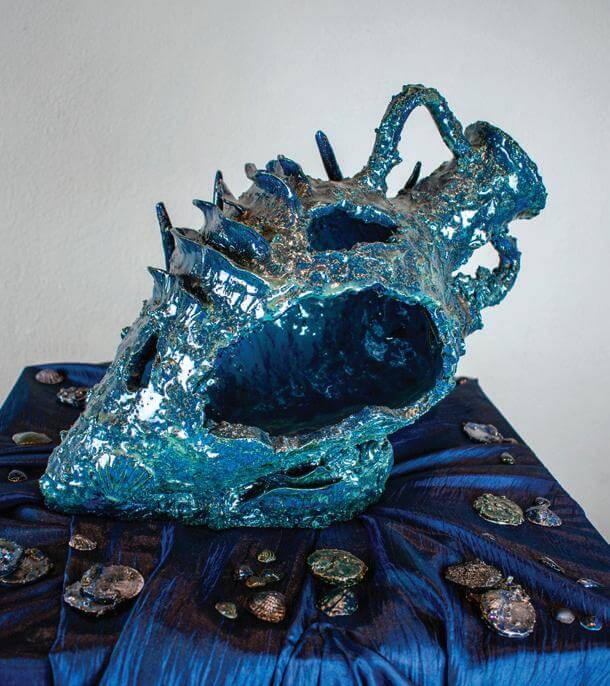As for the glaze, Zydlo chose an uneven blue-green color for the dimension and because it was reminiscent of the reflection of light through dark water—furthering the illusion that all three pieces had been embedded in the sea floor for hundreds of years. To add a look of weathering and tarnish that appears on silver objects in real underwater shipwrecks, Zydlo used black and brown iron oxide on the ship, coins and shells.