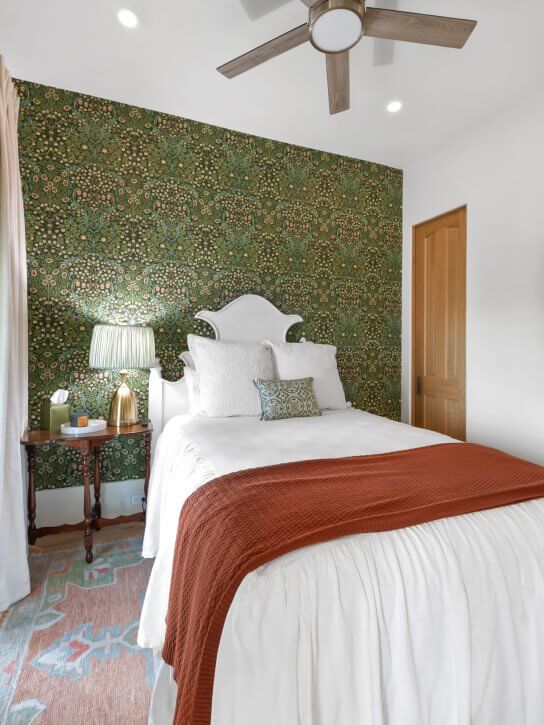 The home uses wallpaper in many rooms and in many ways. One guest bedroom uses a bold green with a pattern that Lewis calls a modern take on an old design. “This was the hardest wallpaper for me to choose because I knew I wanted the more muted one in the adjoining bathroom. They couldn’t compete, but they had to have the same color,” she said.