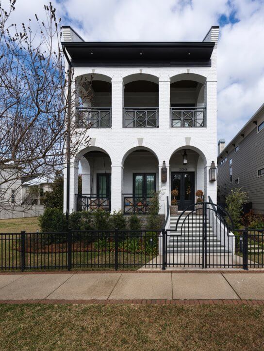 The classical facade is a showstopper. Painted white brick stretches across two stories, with six arches (three on each level) stacked in perfect symmetry, flanked by parapet walls and trimmed in deep charcoal. It combines classical, European and coastal elements in a way that feels natural and intentional. Architect Scott Sallis of Dalrymple Sallis Architecture designed the structure with what he describes as a clean, classical approach driven by the homeowners’ preferences and the Aragon neighborhood’s design guidelines, which steer buildings toward courtyard-centered living and encourage the kind of architectural detail that reads well at street level.