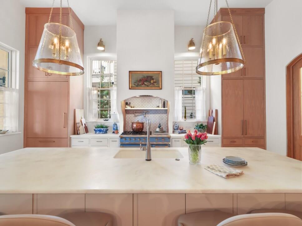 The kitchen began with a tile. The mosaic backsplash behind the custom blue bar cabinet tucked just off the kitchen became the unlikely source of the home’s entire color palette. “A lot of times it’s a rug or a fabric or something that a homeowner loves,” Lewis said. “But basically, the colors of my house are in that tile.”