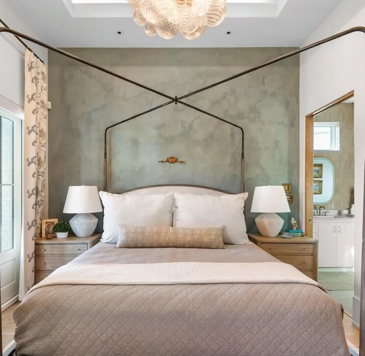 The primary suite carries the home’s water theme into its most elaborate spaces. A four-poster bed sits beneath a bubble glass chandelier that Lewis chose specifically for this room, resisting the common impulse to put it in a living room. “To me, it’s dreamy,” she said. The seascape in the primary bath is a hand-painted mural, commissioned from Bekye Fargason with a request from Lewis to include water, a strong sun and sandy tones woven through. The pale pink handmade Moroccan Zellige tile in the bath and shower is deeply textural and adds both lightness and depth to the room.