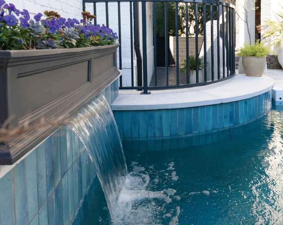Out back, the Aragon design philosophy of indoor-outdoor living is captured perfectly. A covered living room with a brick fireplace and three televisions opens to a courtyard. The pool is small by some standards—Lewis calls it a cocktail pool. It is geothermal, drawing on ground temperature to keep the water swimmable through a Pensacola July. The tile is a Gulf-blue that ties back to the marina and the couple’s love of water.