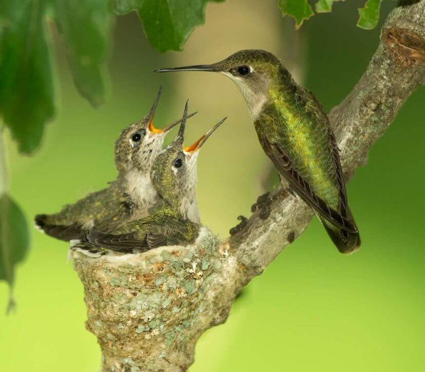 Hummingbirds are masters at camouflaging their nests, making them almost impossible to spot, even when you are looking. They build small walnut-size nests composed mostly of plant down, adorned with lichens and moss, and bound with spider webs or fine plant fibers. According to the UF Department of Wildlife Ecology and Conservation, nests are typically built over water sources for better protection against predators, and to provide a cooler environment.