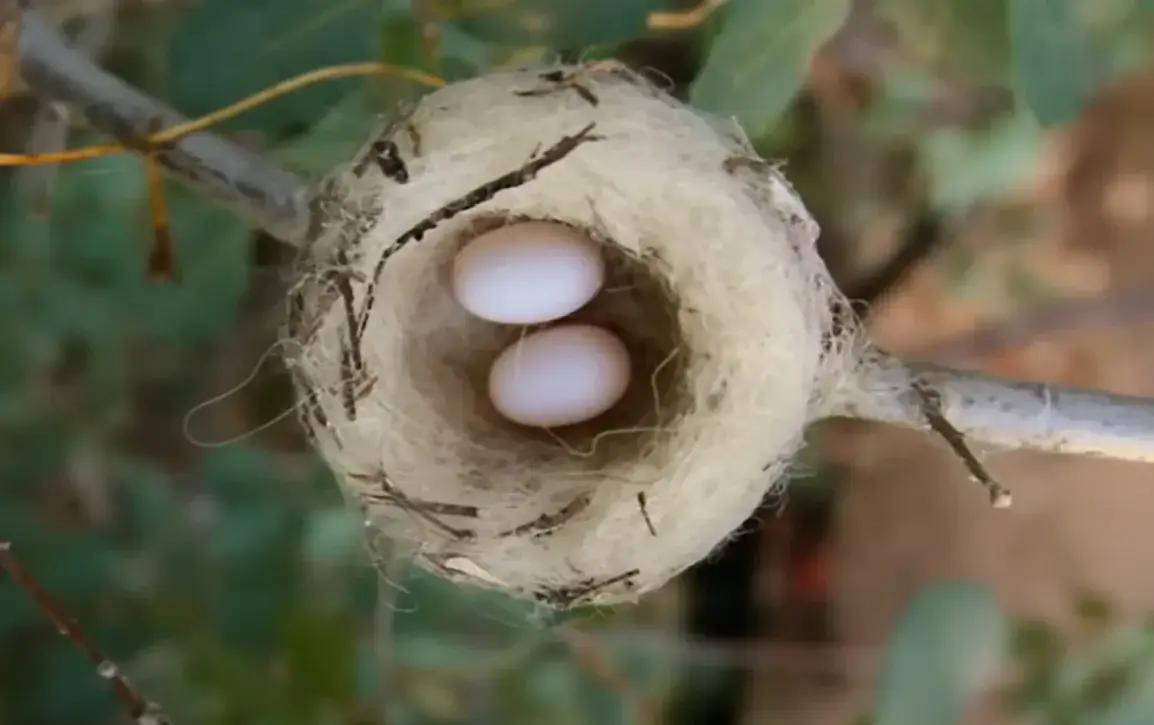 Female hummingbirds lay two very small eggs, measuring less than a half-inch long (the size of a jelly bean). After 20 days of incubation and about three to four weeks of growing, the young hummingbirds are ready to leave the nest.