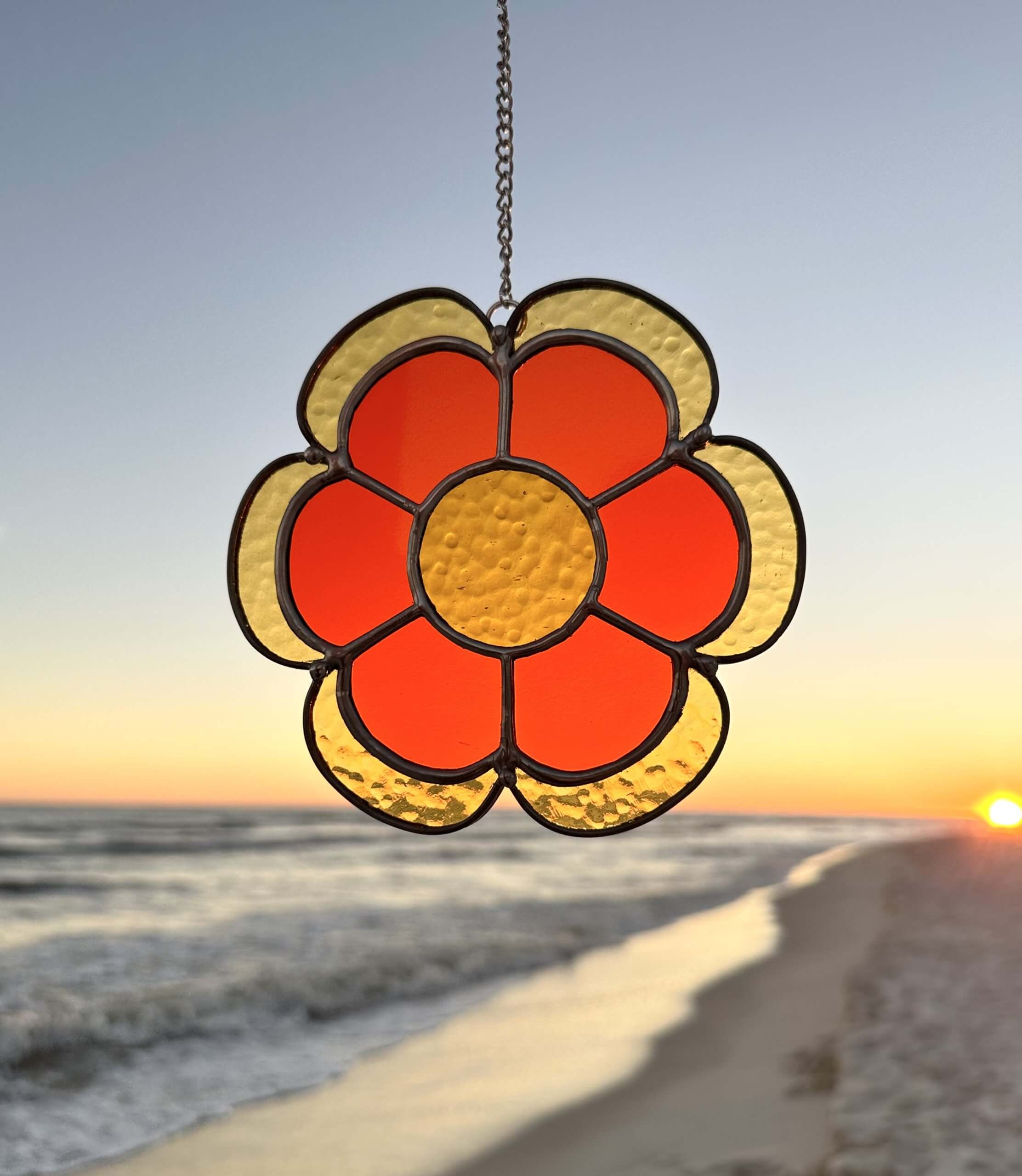 Stained glass artist Darby Beth designs and creates retro-style stained glass art that catch both the eye and the sun. Inspired by design elements of the 1970s, some of Beth’s pieces take the shape of popular 70s motifs like flowers and mushrooms, and other designs depict intricate scenes like sunrises and spiritual displays. A majority of her pieces feature hues of mustard yellows, burnt oranges and browns, with bright pops of avocado green that are a midcentury lover’s dream.