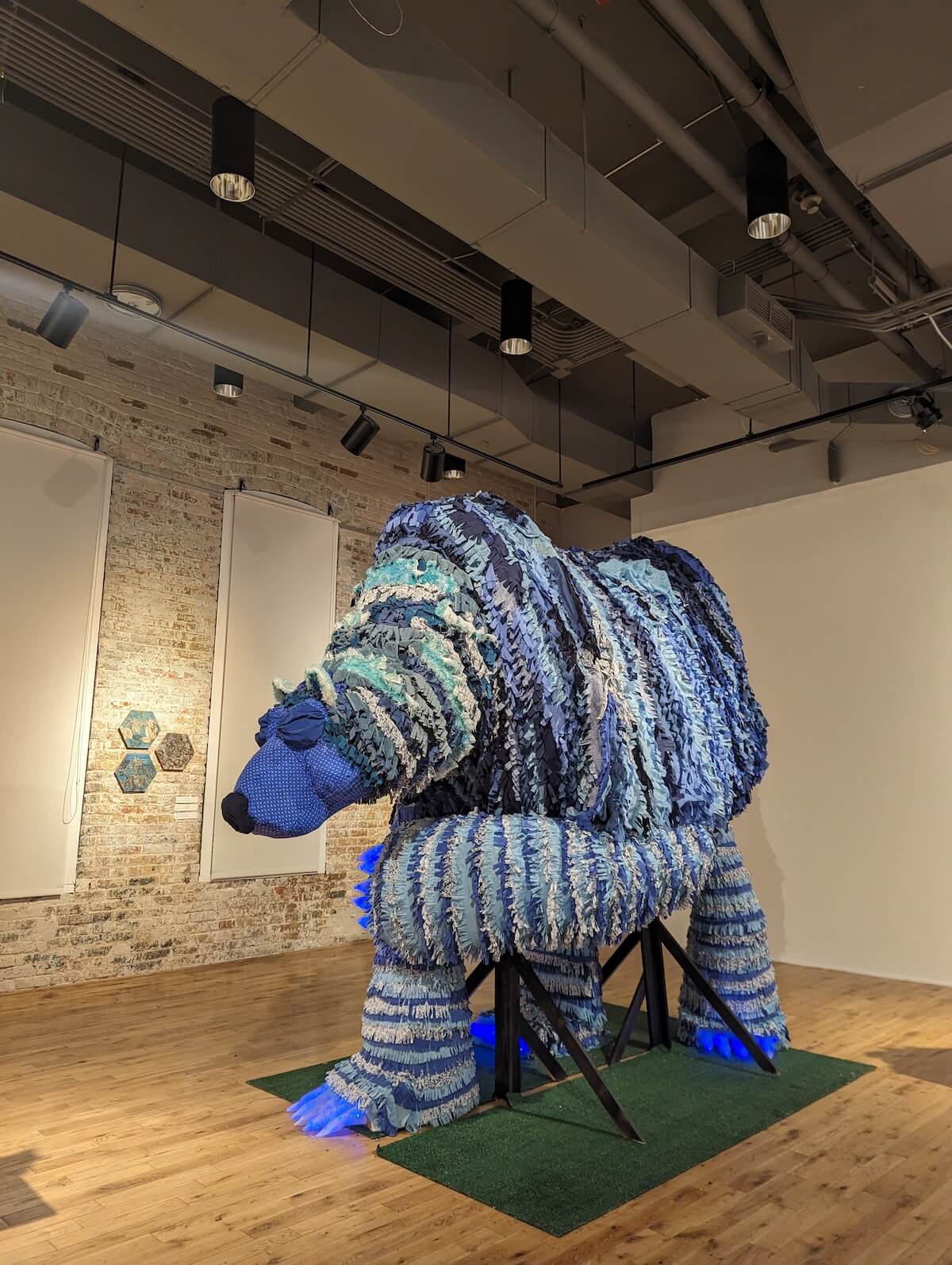You can see the connection to the environment in Kelly’s work from the materials she uses, to the processes she employs. The centerpiece of the exhibition room is a 12-foot-tall bear titled Mother made from Louisiana blue tarps and recycled fabric scraps reminiscent of Cajun Courir costume fringe.