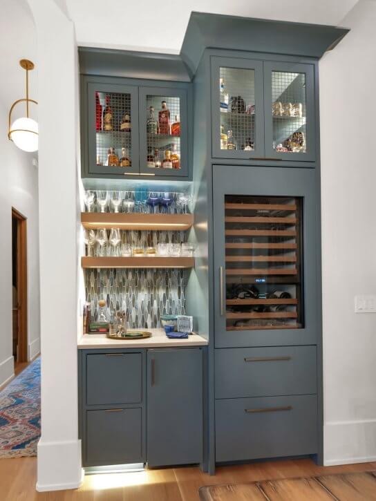 The kitchen began with a tile. The mosaic backsplash behind the custom blue bar cabinet tucked just off the kitchen became the unlikely source of the home’s entire color palette. “A lot of times it’s a rug or a fabric or something that a homeowner loves,” Lewis said. “But basically, the colors of my house are in that tile.”