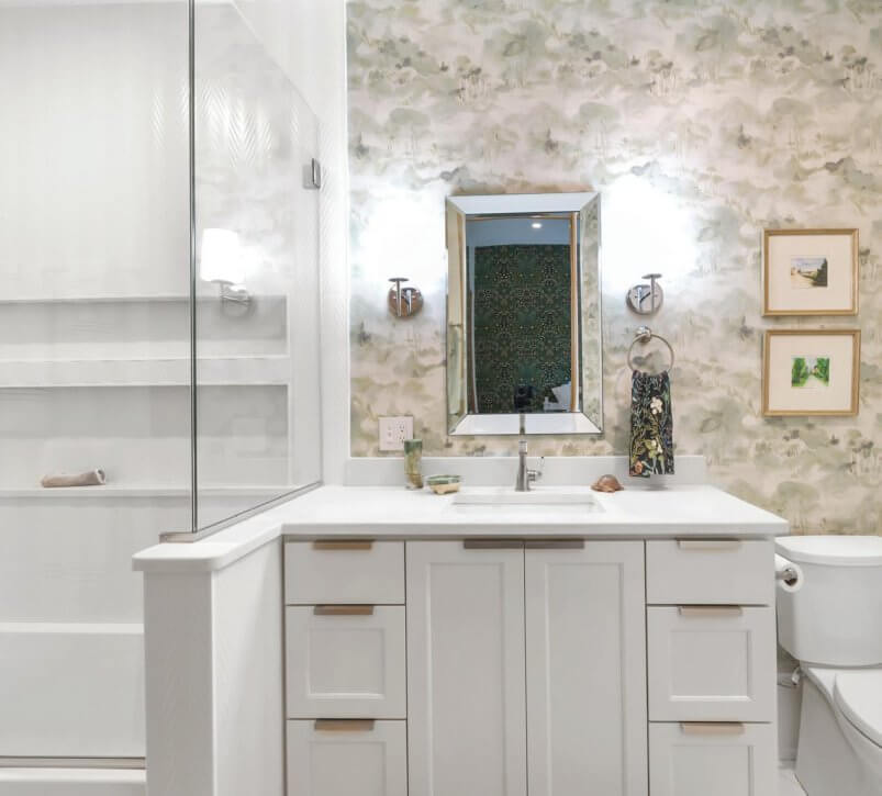 The home uses wallpaper in many rooms and in many ways. One guest bedroom uses a bold green with a pattern that Lewis calls a modern take on an old design. “This was the hardest wallpaper for me to choose because I knew I wanted the more muted one in the adjoining bathroom. They couldn’t compete, but they had to have the same color,” she said.