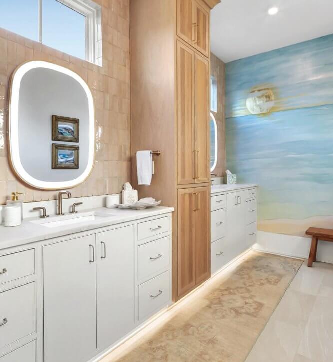 The primary suite carries the home’s water theme into its most elaborate spaces. A four-poster bed sits beneath a bubble glass chandelier that Lewis chose specifically for this room, resisting the common impulse to put it in a living room. “To me, it’s dreamy,” she said. The seascape in the primary bath is a hand-painted mural, commissioned from Bekye Fargason with a request from Lewis to include water, a strong sun and sandy tones woven through. The pale pink handmade Moroccan Zellige tile in the bath and shower is deeply textural and adds both lightness and depth to the room.