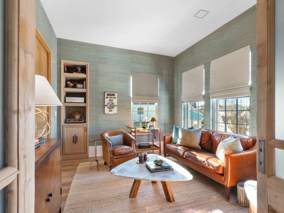 Every room in the house is different by design. The study is the house’s one clear departure from the European palette. The room features grass cloth walls in deep teal green, a cognac leather sofa, a sculptural marble coffee table and extra insulation packed into the walls and ceiling specifically to contain sound. The room was designed around Eric’s love of music. “He enjoys music of all genres and loves sharing it with friends,” Lewis said.