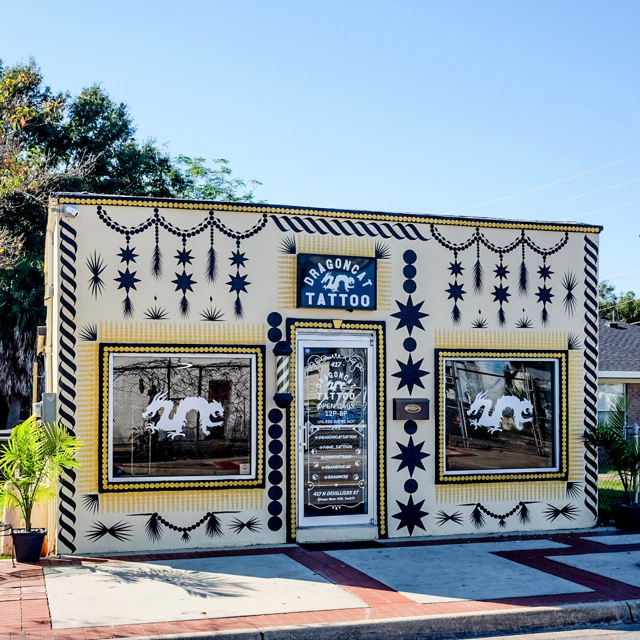 Located in the heart of Pensacola’s BelmontDeVilliers neighborhood, Dragoncat is hard to miss. The quaint building is adorned with gold details and bold, black accents. Inside, flash-covered walls surround the workspaces of the shop’s four co-owners, Shauncey Fury, Alex Fame, Ryan Boxcar and Josh Adams.